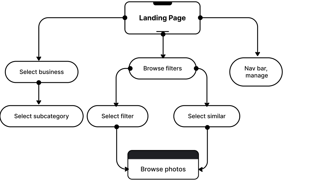 This user flow helps us to understand all possible ways a user can navigate through the image repository after landing on the home page. Though this seems like a working model at a glance, we knew that there wouldn't be complaints if it worked as intended.