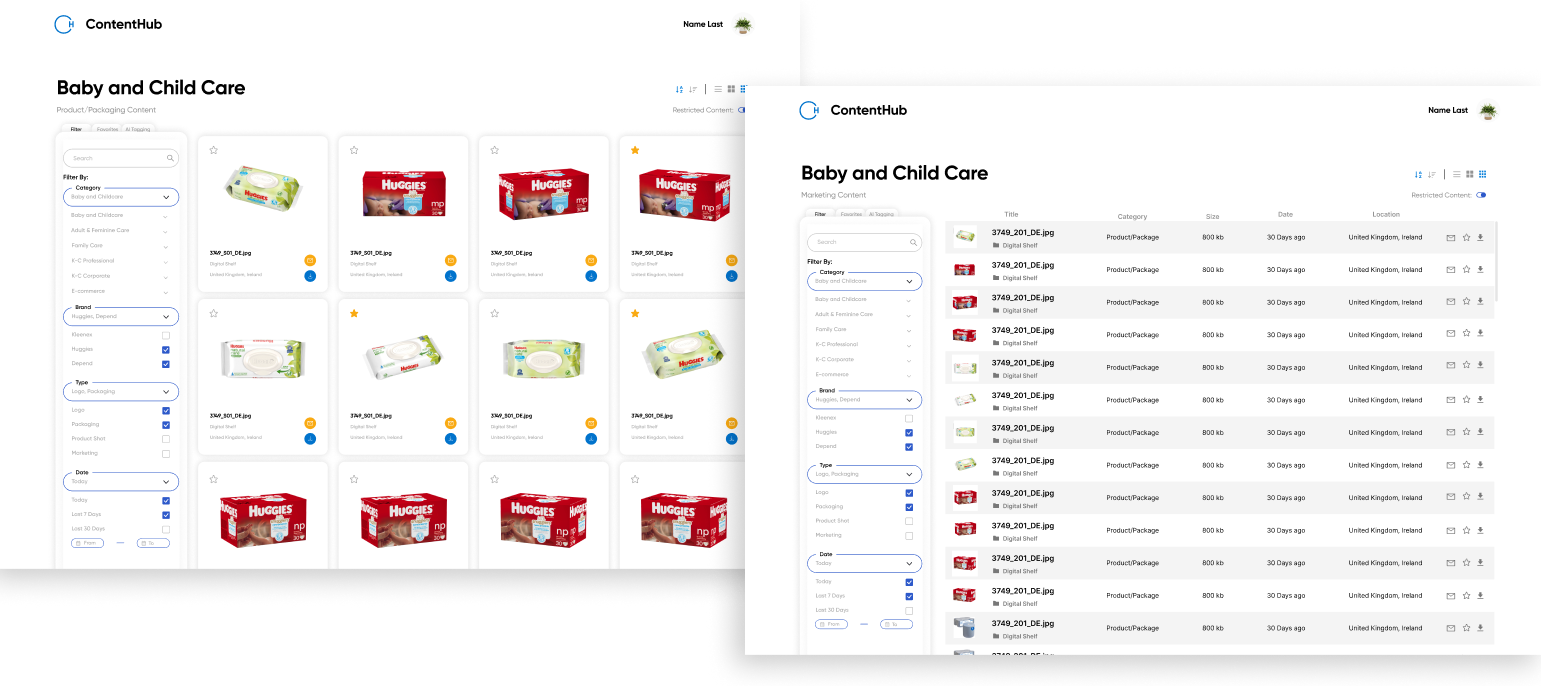 For our gallery view, we made several changes. Filters were simplified and moved to a left column due to the high number of options there were, and a search bar added. Repetitive ones were removed. Grid and list view options were introduced as well as quick sort by alphabetical or date order.