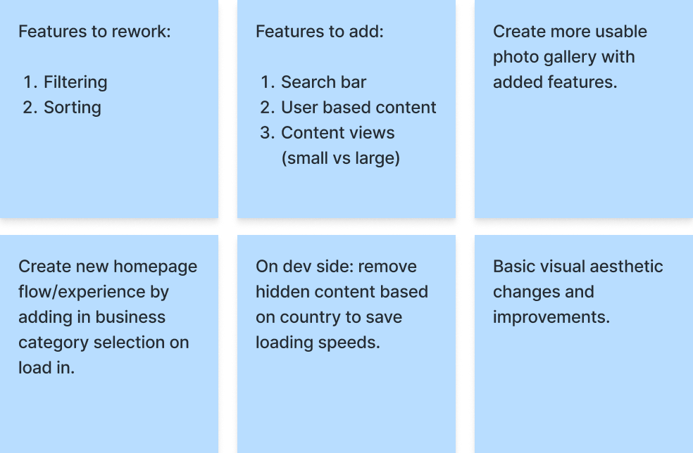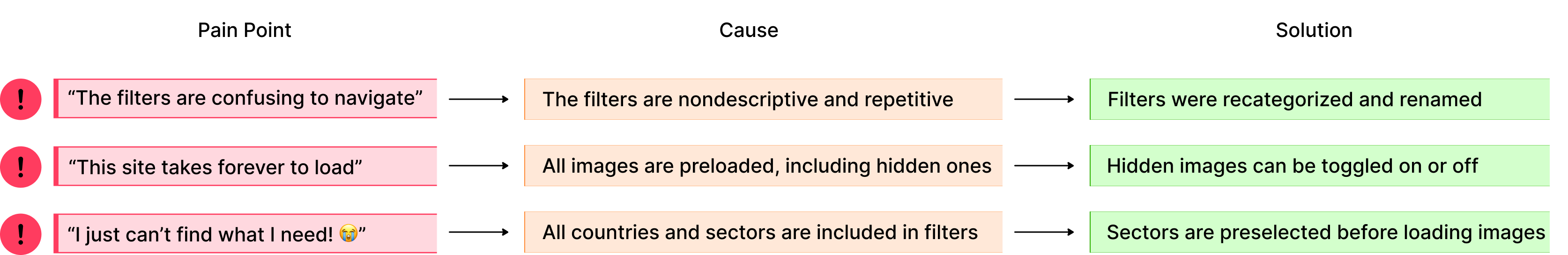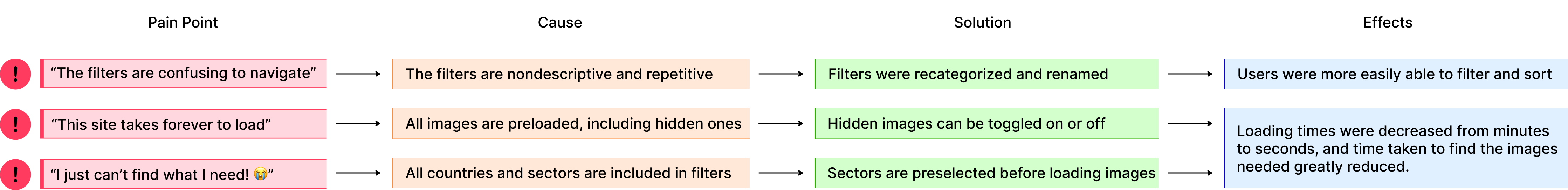 To circle back on our initial goals, we can say that we've provided solutions to the main pain points: confusing filters, slow loading times, and difficulty in finding specific images they needed. Though the gallery page wasn't prioritized in this stage, our redesigned were archived for the next round of designers to work on. However, due to this we can't definitively say that all pain points were solved since we lacked time to properly user test the final iteration.