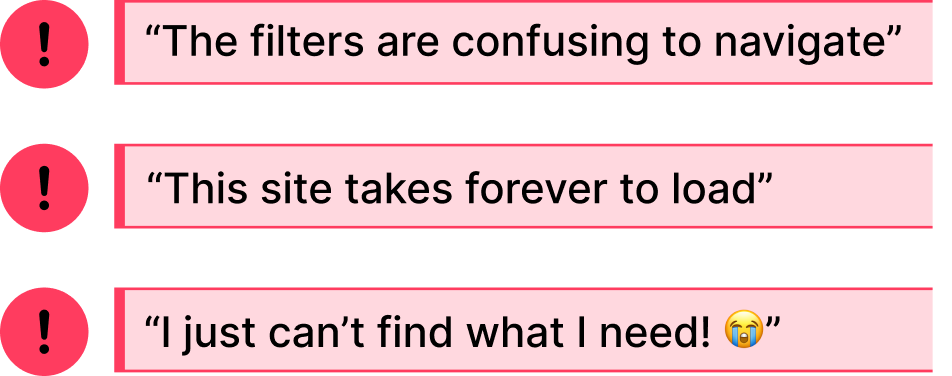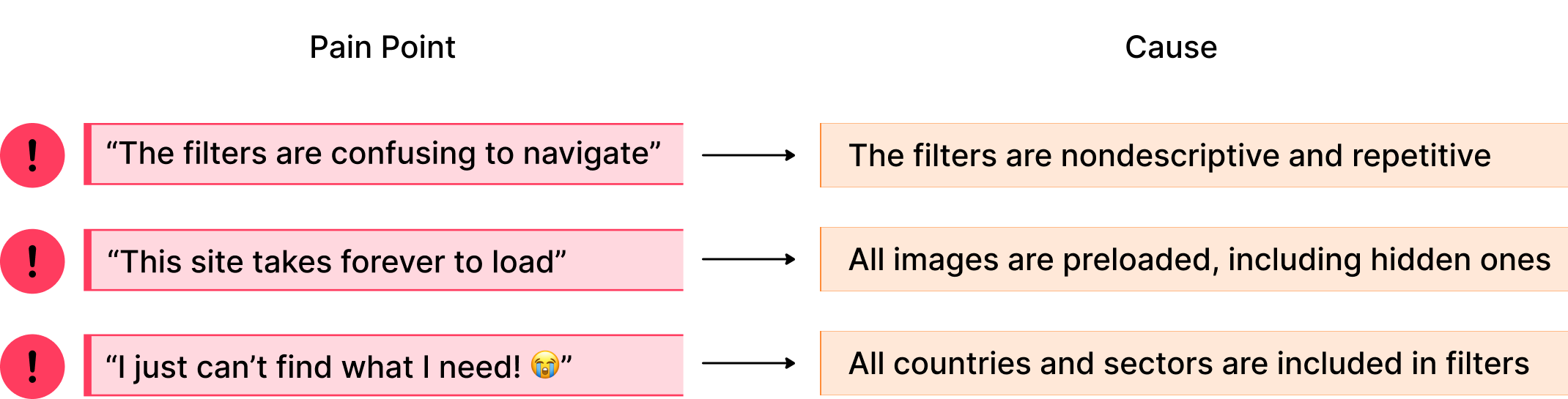 These comments were passed to my partner and I as the top priority "issues" to solve with our redesign. Even from my own observations, these comments were brought up often as remarks and complaints in many design meetings I attended.