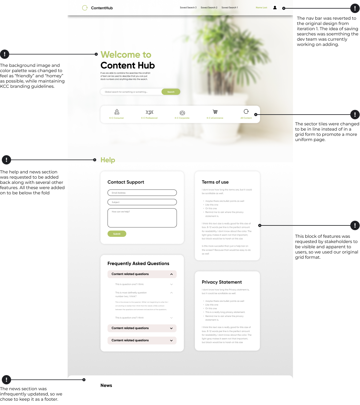 With these points, we drafted our initial prototype to present to stakeholders. While aware that some changes would be dependent on the dev team's capabilities, many updates were made taking into consideration that those changes may not be possible.