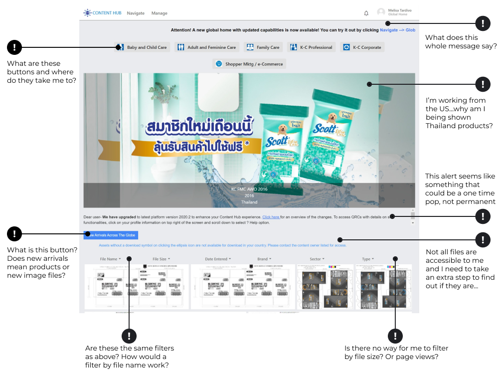 We approached this evaluation from the lens of a typical KCC employee: though they use this site often, they encounter the same problems each time. Therefore, we took note of what could cause frustration in Content Hub's most used assets such as the filter/sort tabs and the photo gallery. After reviewing our comments, we hypothesized three main possible causes: