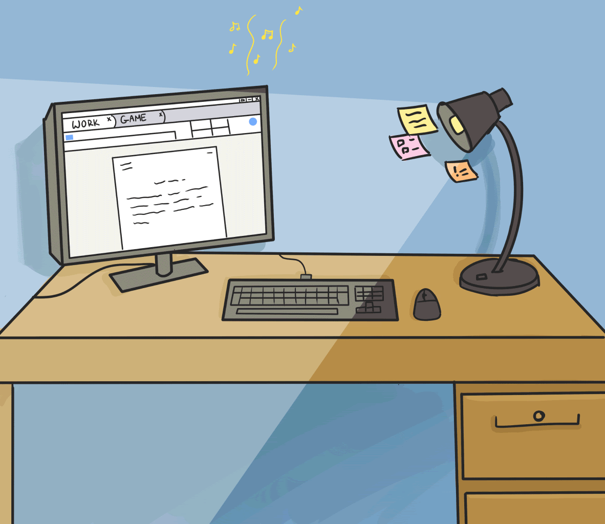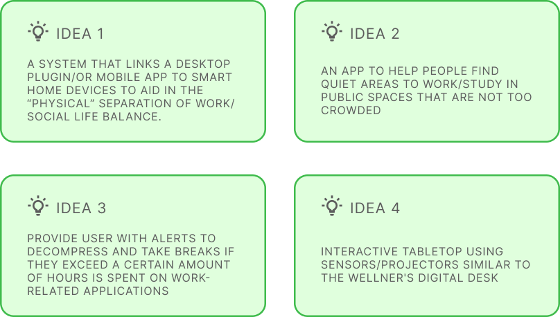 Our final solution idea was a system that links a desktop plugin/or mobile app to smart home devices to aid in the “physical” separation of work/social life balance. Based on the type of activity that the user is engaging in (work or social), the system will change the ambient settings accordingly (e.g. relaxing music for personal time, bustling café noises for studying).