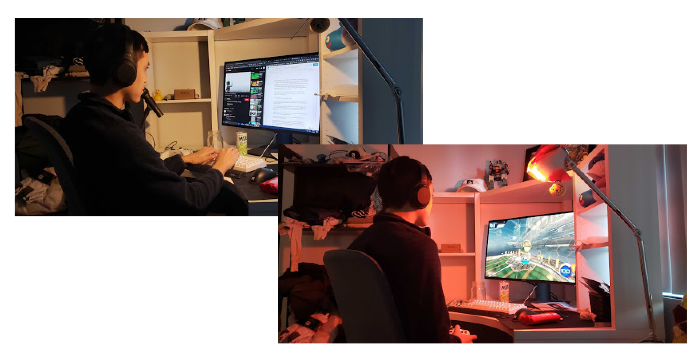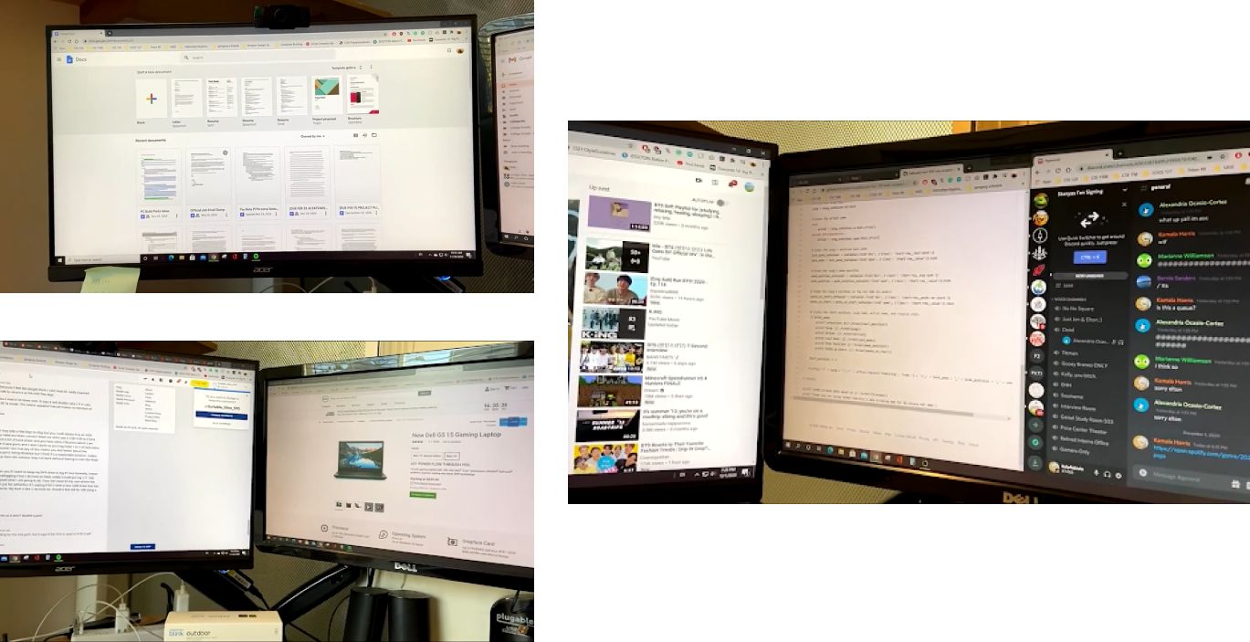 (Top left) the student is full concentrated on schoolwork in the morning (Bottom left) by the afternoon, they are browsing shopping sites while the other screen is working (Right) the student is struggling to fight distractions while still working late at night