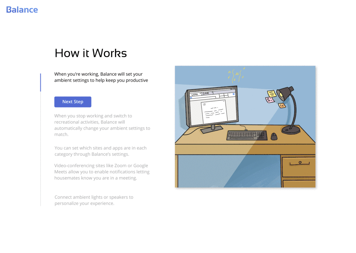 Our extension Balance works by letting users essentially 'whitelist' different websites or desktop apps and tie to to specific lighting or musical playlists so that whenever they switched onto those apps/tabs, their environment would change with them. The settings are all entirely customizable as well - users can create their own settings, environments, and tab/app groups. Furthermore, they can add household members that would receive a quick text each time they need to join meetings.