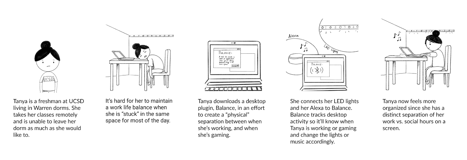 We also fleshed out a storyboard for the problem at hand and how we were planning to solve it with our refined proposal: Balance, a desktop plugin or extension that would help users imitate a shift in environment as they worked.