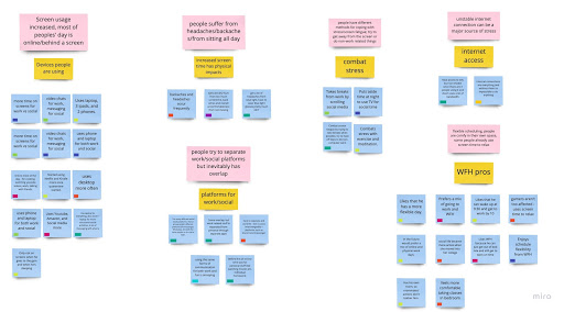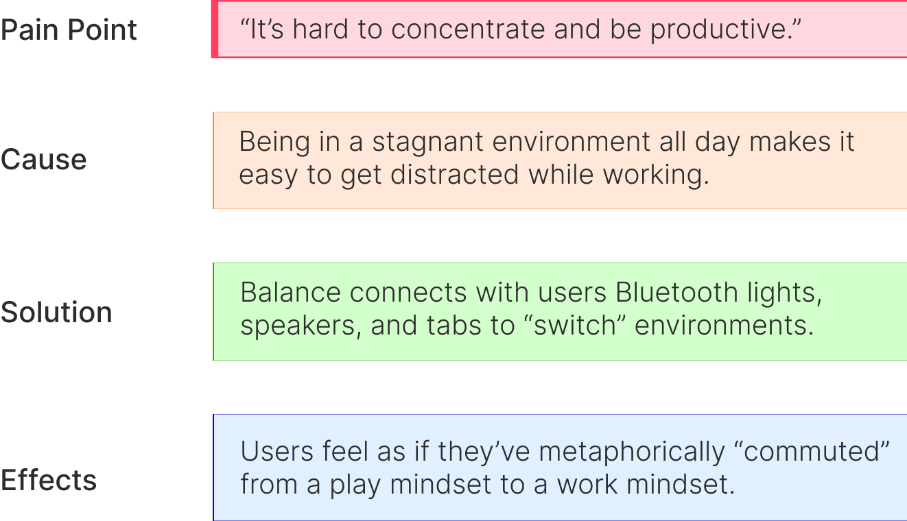 Because of this, we redefined our problem space to "People find it difficult to become immersed in what they are doing due to having more distractions. They are not being as productive as they want to be while working and are mentally “on-the-clock” during personal time, leading to feelings of stress and exhaustion."