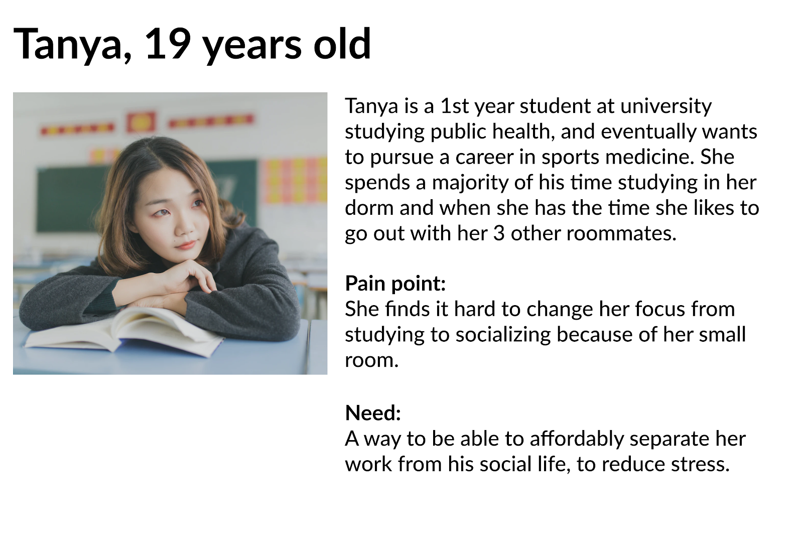 Once our diary studies were done, we compiled all the information into a general persona: Tanya, a first year college student. This would help as a reference for who we were designing for in the next stages.