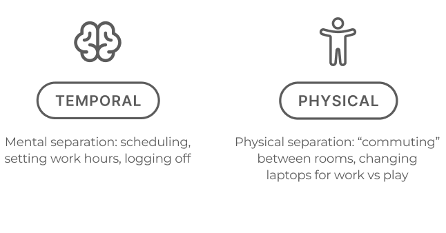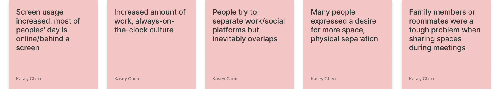 We concluded that many people are already separating work/social life through scheduling (Google Calendar, planners, etc.) but it wasn't enough for them to feel comfortable to do so daily. Furthermore, a common topic brought up was the overload of screen time causing stagnant workflows; many people tried combatting this by going through the motions of "commuting" to work by going from bedroom to living room.
